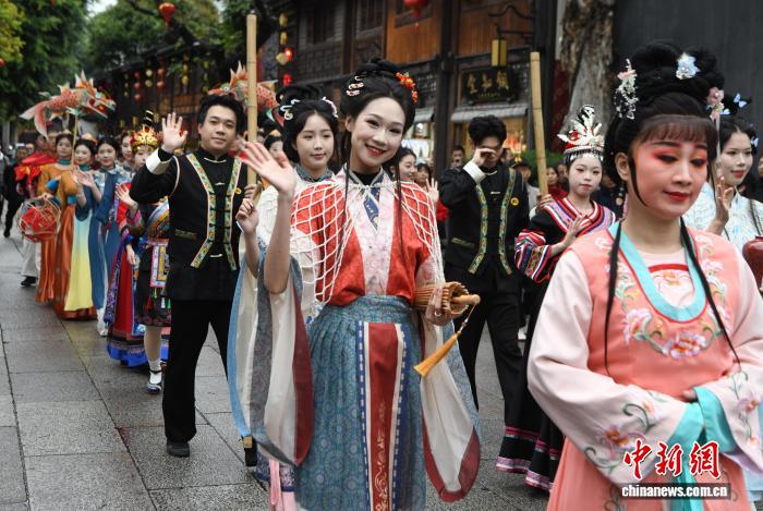 3月3日,祸修祸州3坊7巷古街区“非遗”巡回闹元宵。闽剧、祸州3宝、青白酒、畲族文明、油纸伞、鱼灯取滚灯6年夜特点圆阵顺次明相,从静态呈现变成动静前进,让闽皆“非遗”正在坊巷间精巧死辉,为乘客带去沉溺式体味。图为前进式“非遗”巡回。中新社记者 王东亮 摄